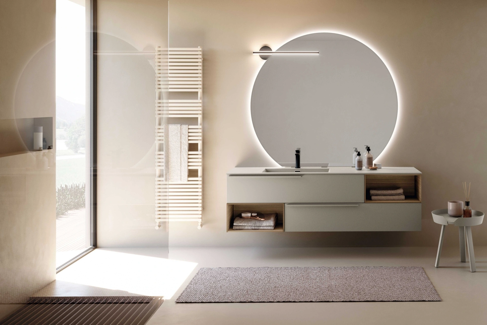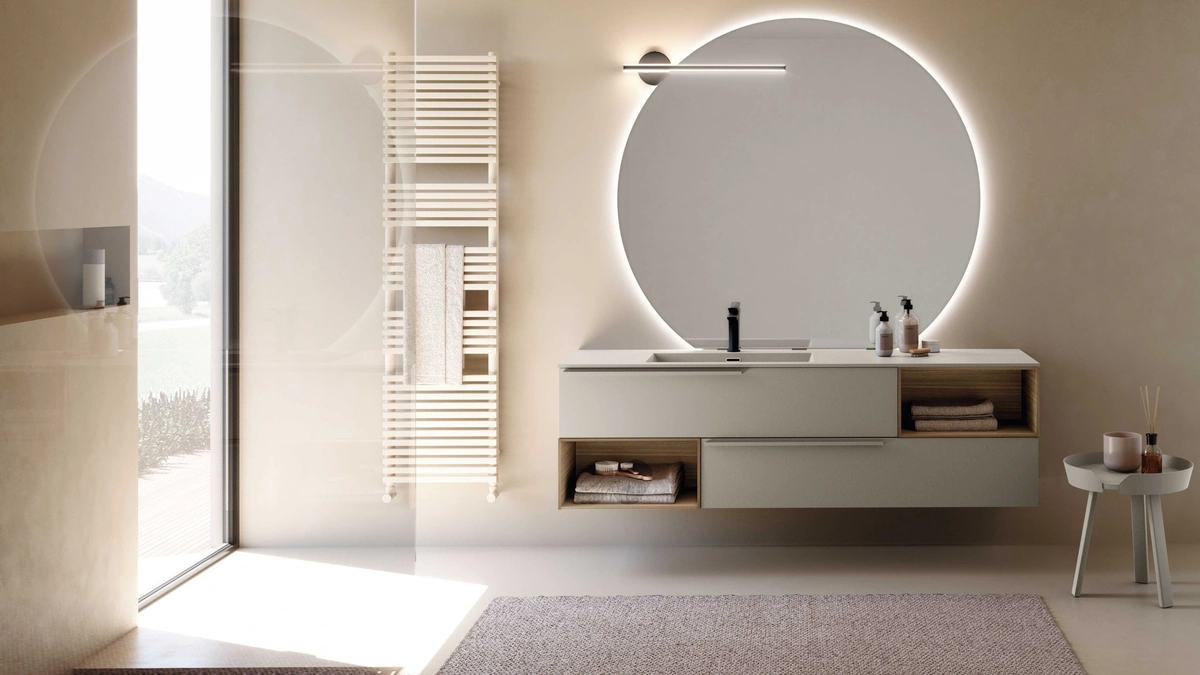 mobili bagno sospesi in laccato opaco del marchio Baxar: clicca e scopri l'arredo bagno moderno M System 041 per la stanza del benessere.