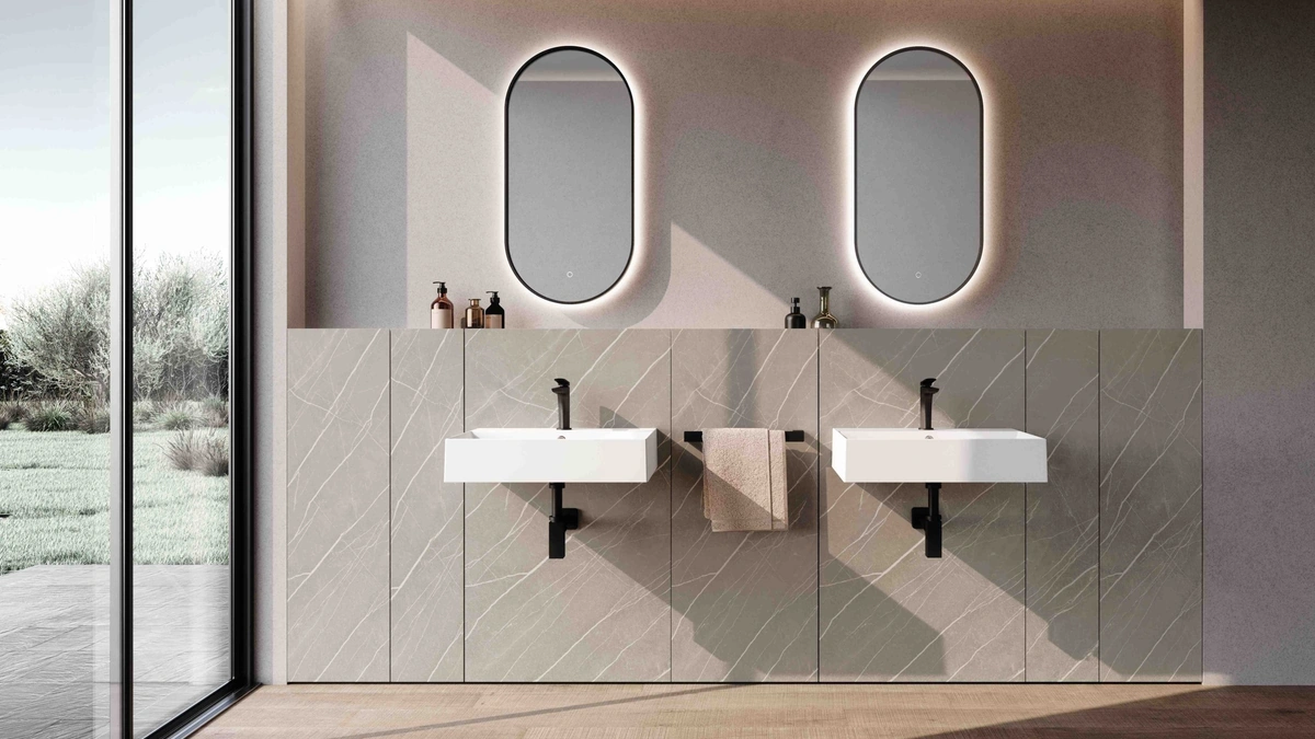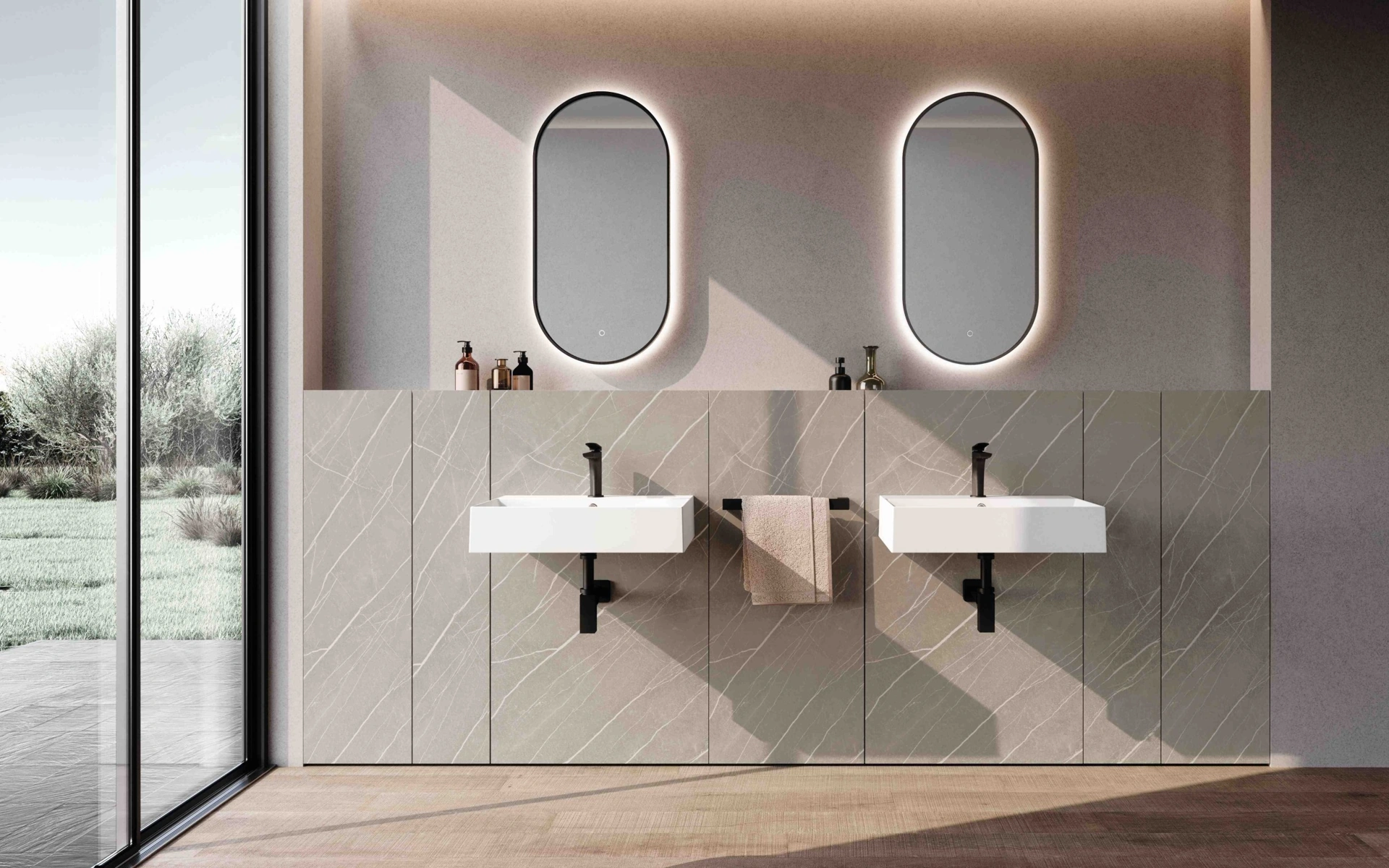 Ottieni informazioni sull'arredo bagno moderno: mobili bagno a terra in HPL come il modello M2 System 243 di Baxar ti attendono.