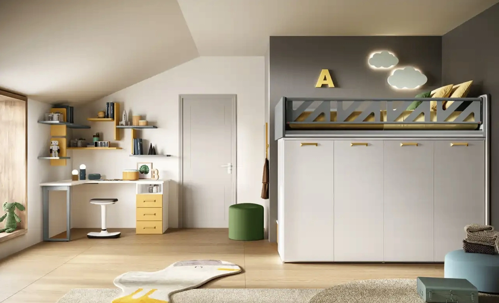 Con questa cameretta K109 Moretti Compact Camerette, tra le soluzioni a soppalco, potrai progettare stanze moderne per bambini.