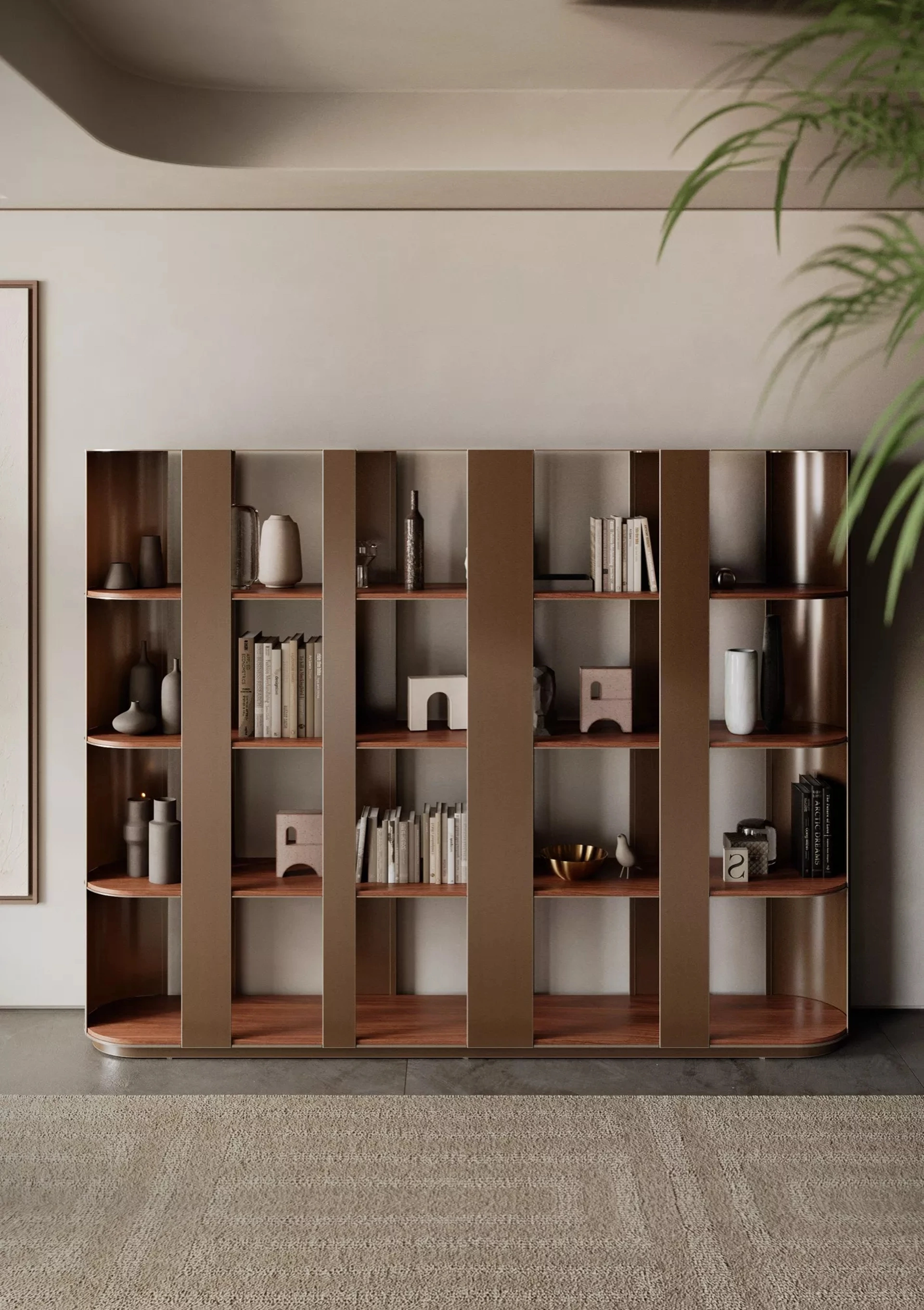 In showroom troverai vari modelli di Librerie divisorie design per il soggiorno, come il modello in metallo in foto.